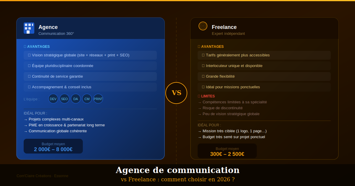 Agence de communication vs freelance : comment choisir en 2026 ? Vous avez un projet de communication : création de site, refonte de logo, gestion